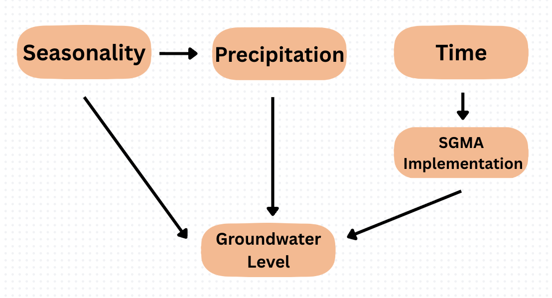 This directed acyclic graph (DAG) visualizes the different causal relationships influencing groundwater levels.
