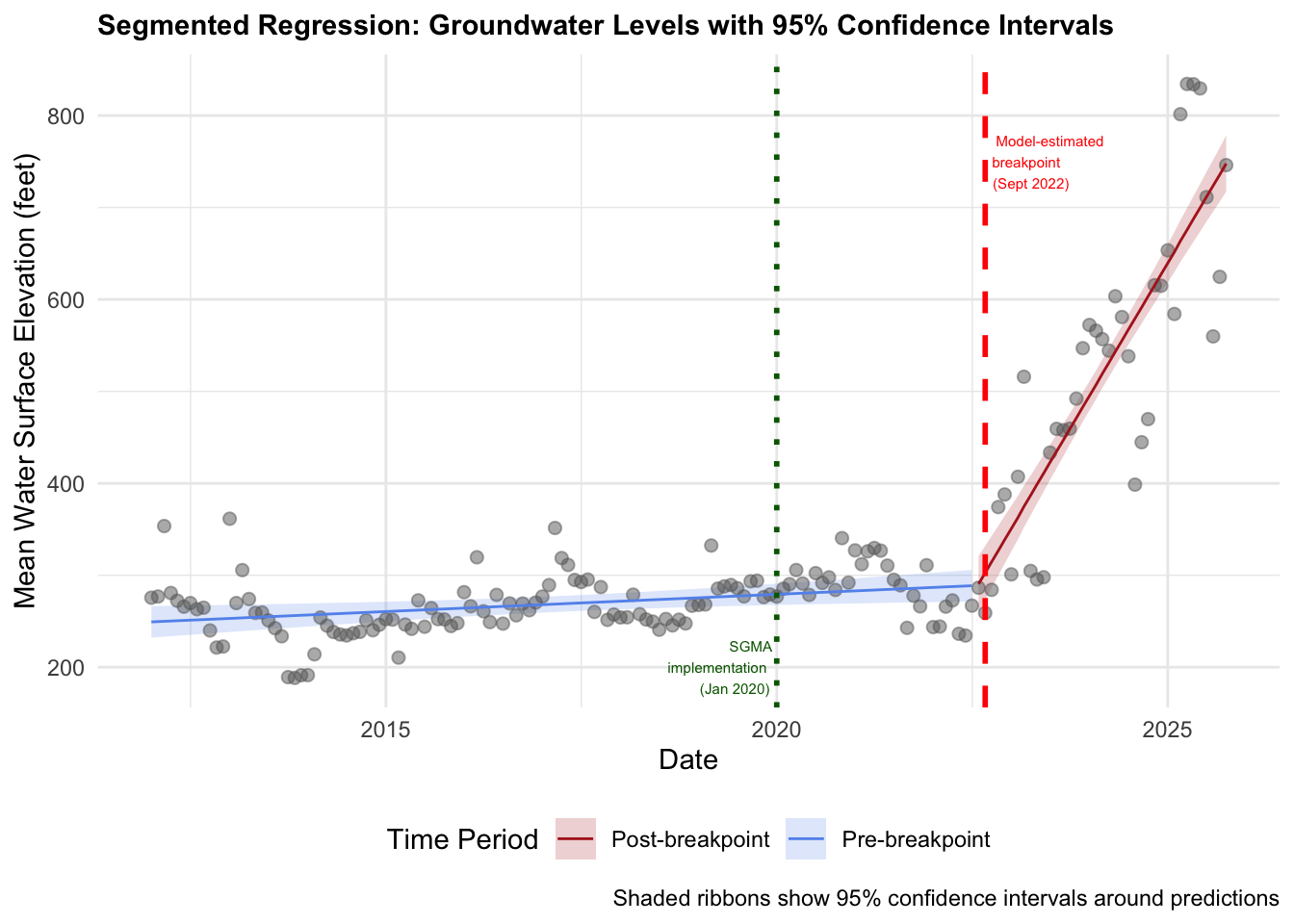 title = "Segmented Regression: Groundwater Levels with 95% Confidence Intervals",