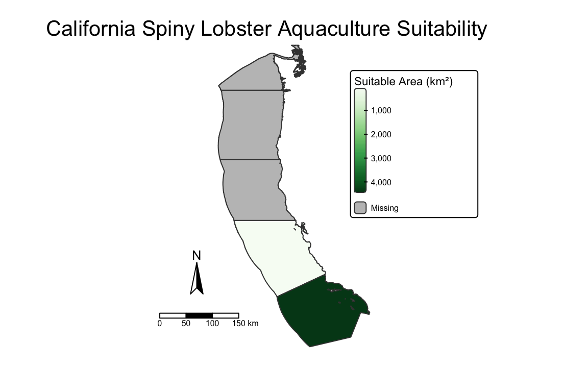 Southern California is found to be the most suitable region for California spiny lobster aquaculture since it contains the largest area of optimal conditions - warmer waters and appropriate depth profiles.